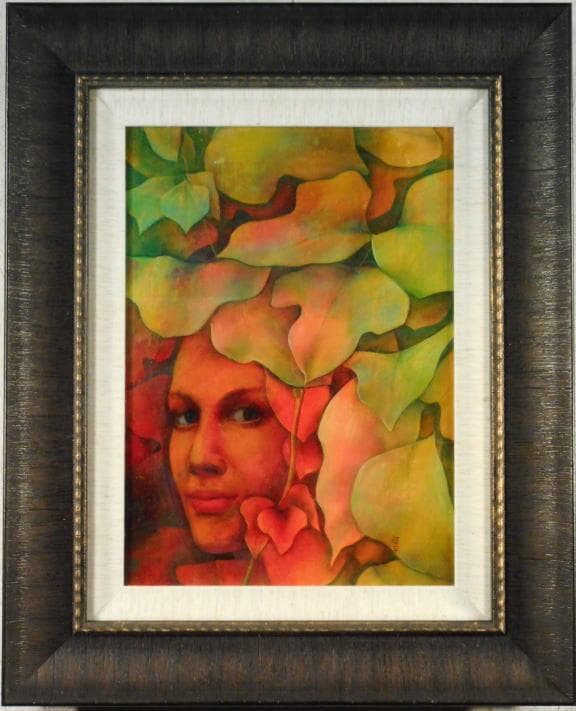 世界にたった1つ❤️\r*この作品は定価格となっております\r*【 市場価格 額付きF6号/ uF6号の場合: 240,000円(40,000円/号x 6号) 絵のみの場合: 225,000円 】\r\r<油絵のサイズ> 40.5cm x 31.0cm ( 日本サイズのF6号よりも上下左右 5mmほど小さい) \rサインあり(小さく右下か左下、あるいはどこかに自筆で、裏には落款印が押してあります 2003年制作 )\r画布の耐久性保持のため、裏にジェッソを塗布している場合があります\r【画法】最初にキャンバスの上にモザイク型に6色(黄、オレンジ、赤、黄緑、青、黒)を塗り、それを下地に絵を描きます。その下地の色がちらほら見え隠れし、それが効果を奏し魅力的な絵になっています。\r\r◼ <額縁のサイズ> 約 57 cm x 48 cm\r◼ <額縁の色> 黒 / モダンでおしゃれな感じで、どの絵にも合います\r* U.S.サイズの絵のため、額を少し調整いたします \r*フック付き\rこのフックは釘が斜めに壁に入るため、抜いた後でも穴の跡が目立ちにくいです 掛ひもはご購入時のままフックにお掛けください 表から掛ひもやワイヤーが見えないため、すっきりと美しく飾れます\r\r◼ 絵のみ ( 225,000円 ) 又は 他の額付きご希望の場合は【 uF6-061203 】でご検索ください\r\r\r作家紹介 \r菅家令子(かんけりょうこ) 洋画家 創作写真家\r\r個展/展覧会\rニューヨーク パリ,カンヌ / フランス ミュンヘン /ドイツ シカゴ ウイーン / オーストリア 東京 他\r\r出版物\r「写真集」“ 女R-I ” 永久保存 \r近代美術館(MoMA) / ニューヨーク スミソニアン博物館 / ワシントン\r「絵本」 “ん”\r「論文」 “ 写真表現における芸術性について ” / 日本写真芸術学会\r\r\r#絵画 #洋画 #絵 #油絵 #インテリア #モダン #おしゃれ #モダンアート #癒し #魅惑的 #豪華 #高級感 #結婚祝い #プレゼント #出産祝 #新築祝 #建築祝 #開店開業祝 #祈り #希望 #幸運