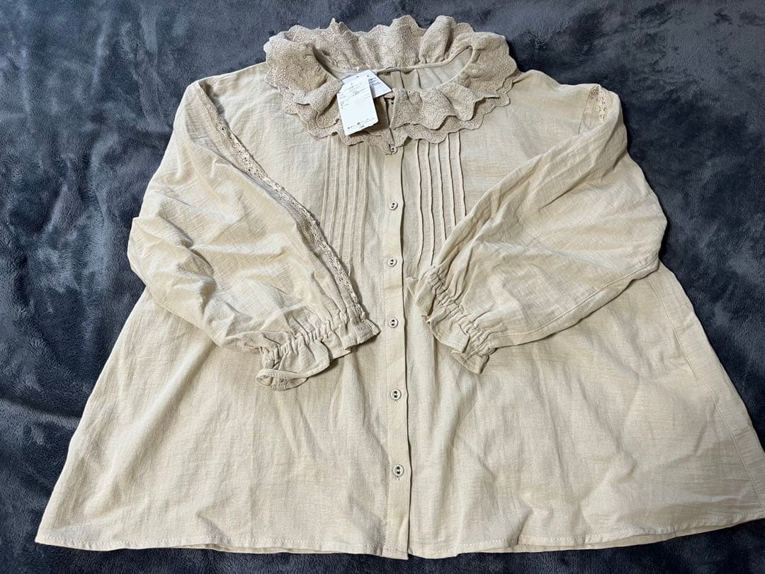 アクセスくださりありがとうございます。裾部分に重ねたフリルが素敵なブラウスです。腰のラインに2重に重ねてボリューム感があるので、タックパンツなどにあわせてもお腹周りが目立ちにくいのも嬉しいポイント。衿元は緩めに開いているので、女性らしく着て頂けます。素材:ポリエステル100%洗濯表示:手洗い可肩幅 42cm 着丈 63.3cm 袖丈 50cmウエスト:103.2cm 裾幅:137.6cm袖口周り:21cm一度短時間着用しています。