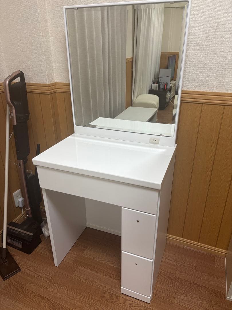 鏡のタイプ···一面鏡特徴···コンセントあり、収納棚あり、引き出しありテイスト···洋風主な素材···木寝室に置くドレッサーは、寝姿を鏡に写すのがよくないとよく言われてもいるので、鏡を収納できるタイプを探していて、大変気に入って購入したんですが、引っ越してから部屋も狭くなり、使わなくなったので出品いたします。宜しくお願い致します。幅90cm ✖️ 奥行46cm ✖️高さ70cm特徴···完成品,コンセントあり,収納棚あり,引き出しあり